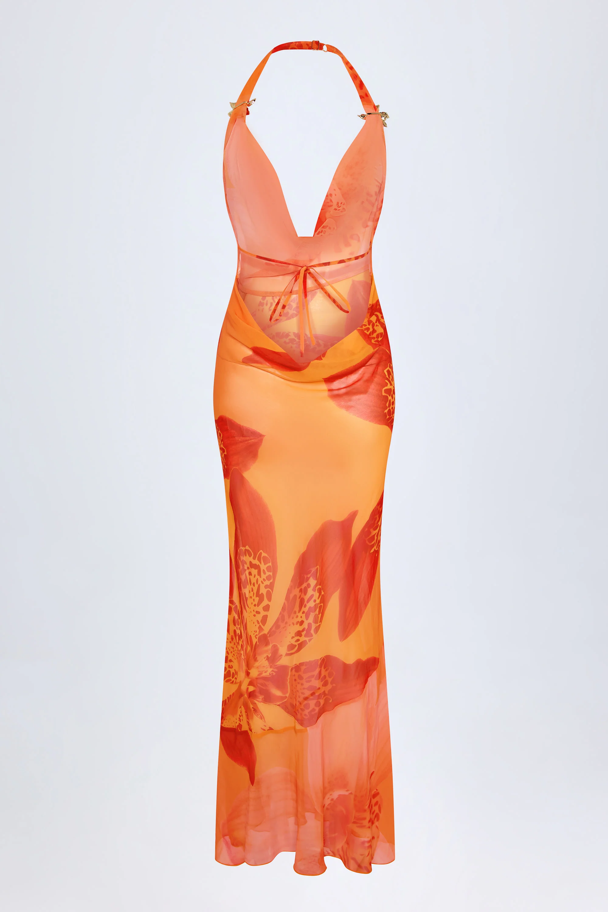 Cowl-Neck Hardware-Detail Maxi Dress in Orange Orchid Print