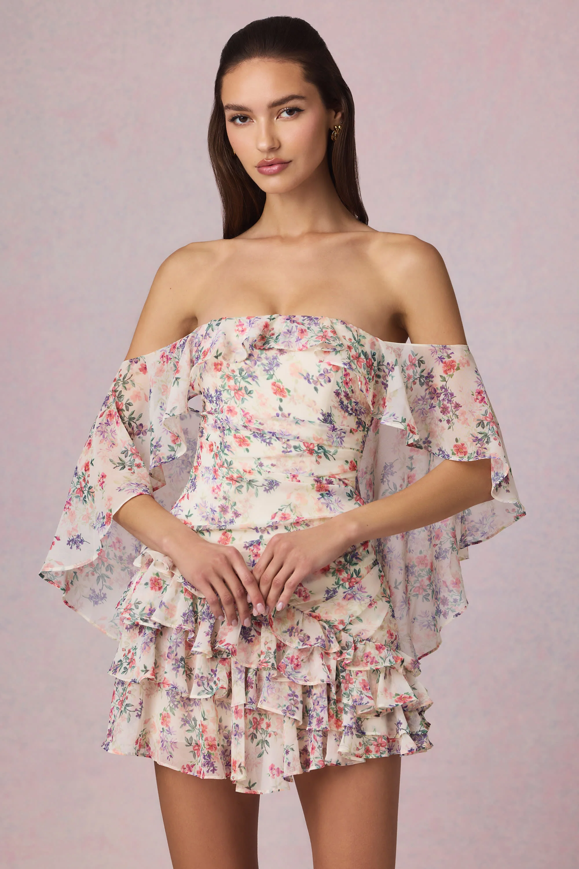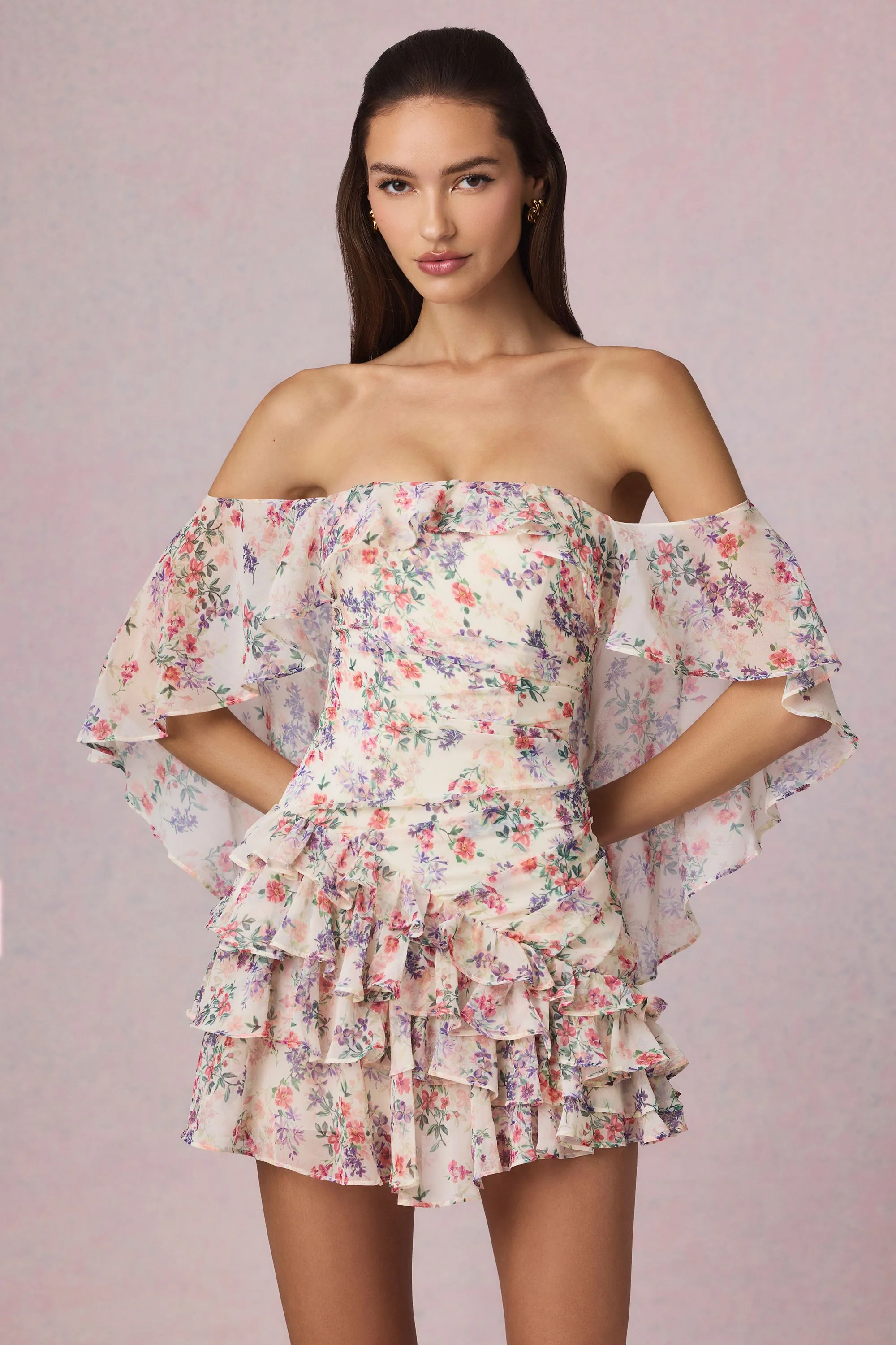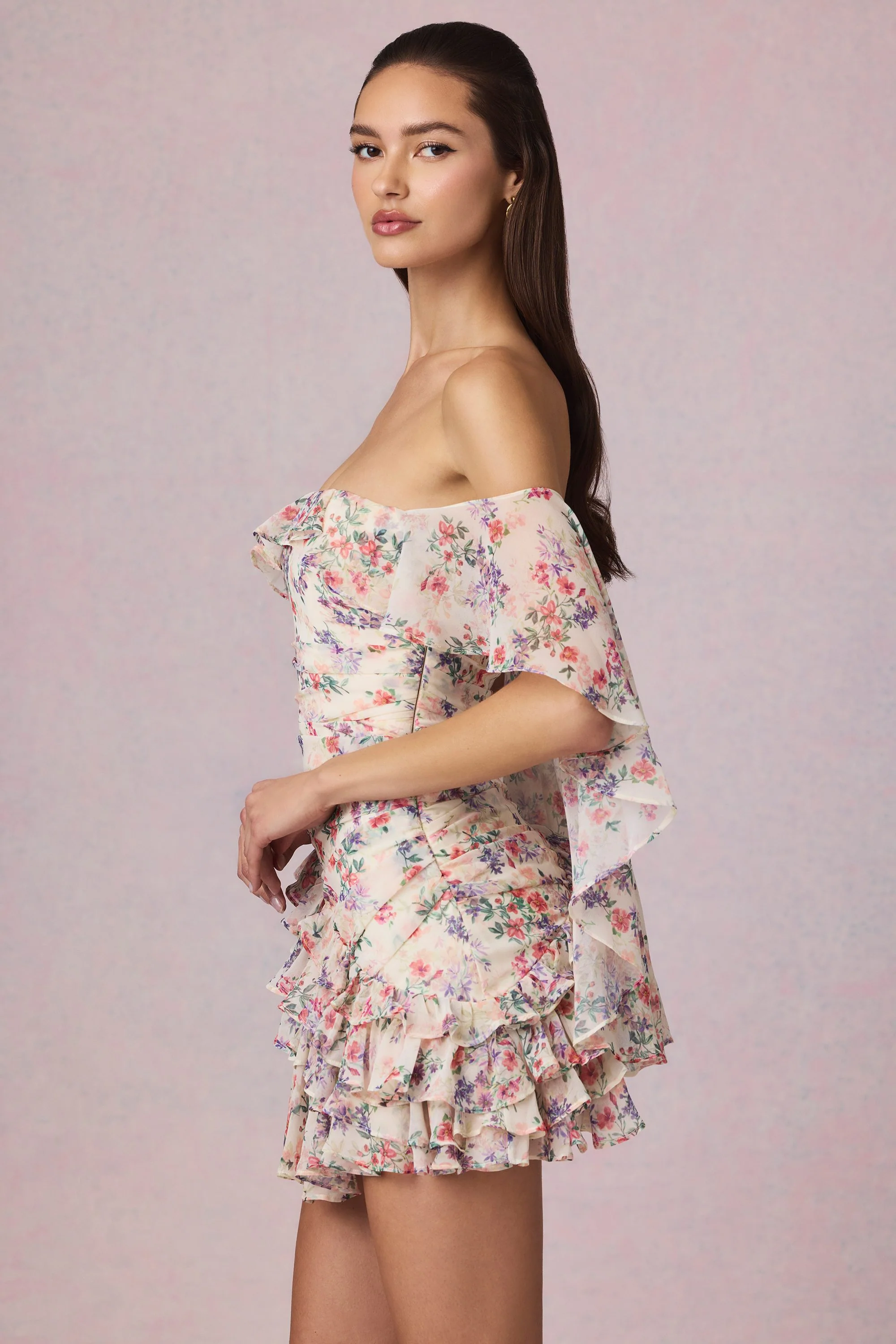 Off-Shoulder Ruffled Mini Dress in Primrose Floral Print