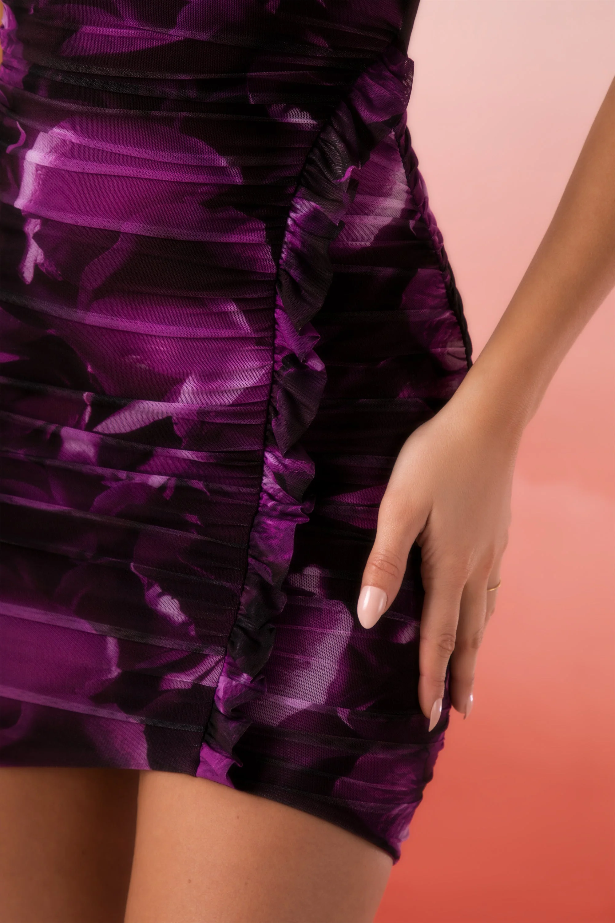 Long Sleeve Ruffle Detail Mini Dress in Multi Print