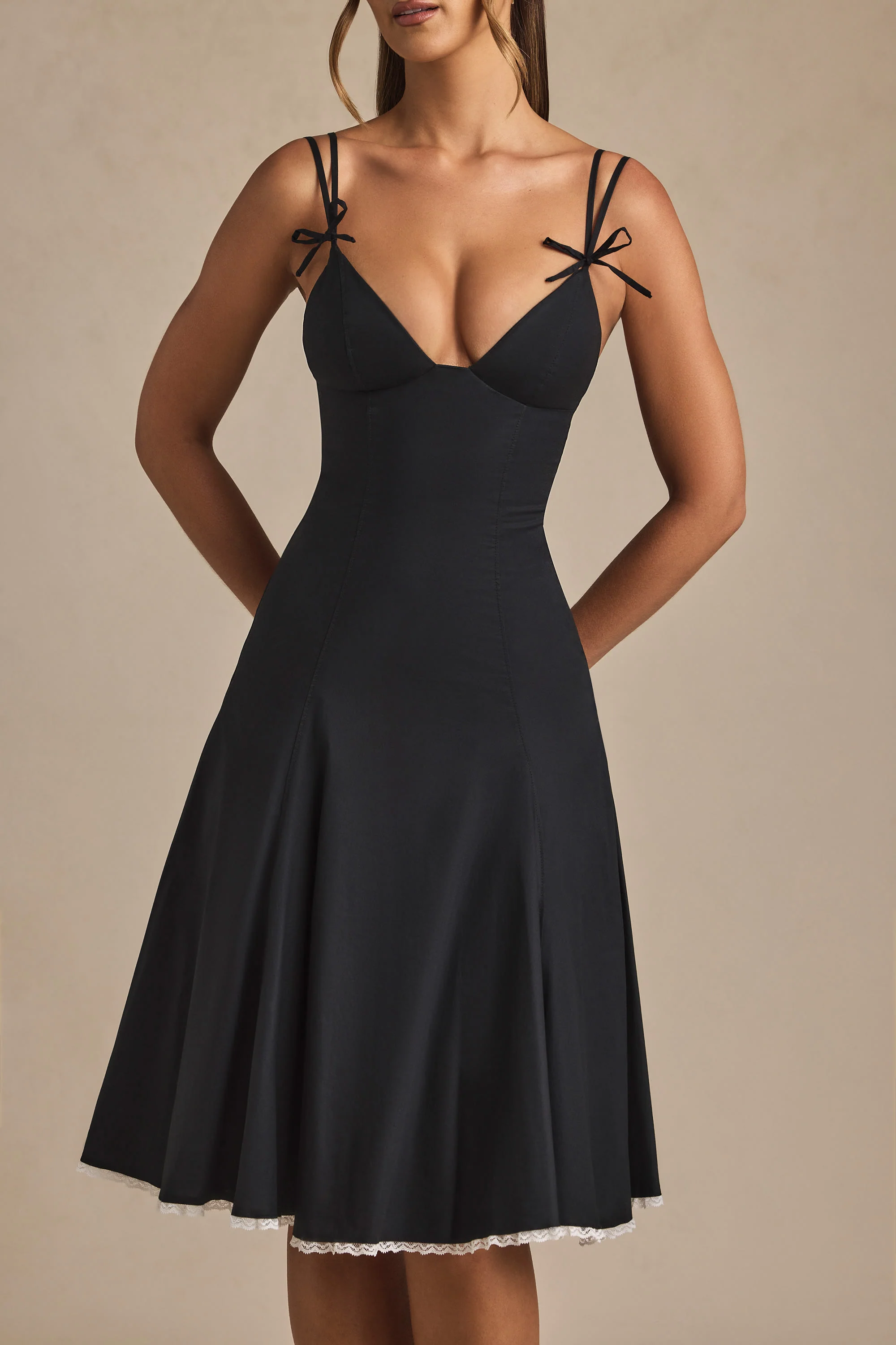 Bow-Detail Lace-Trim A-Line Midi Dress in Black