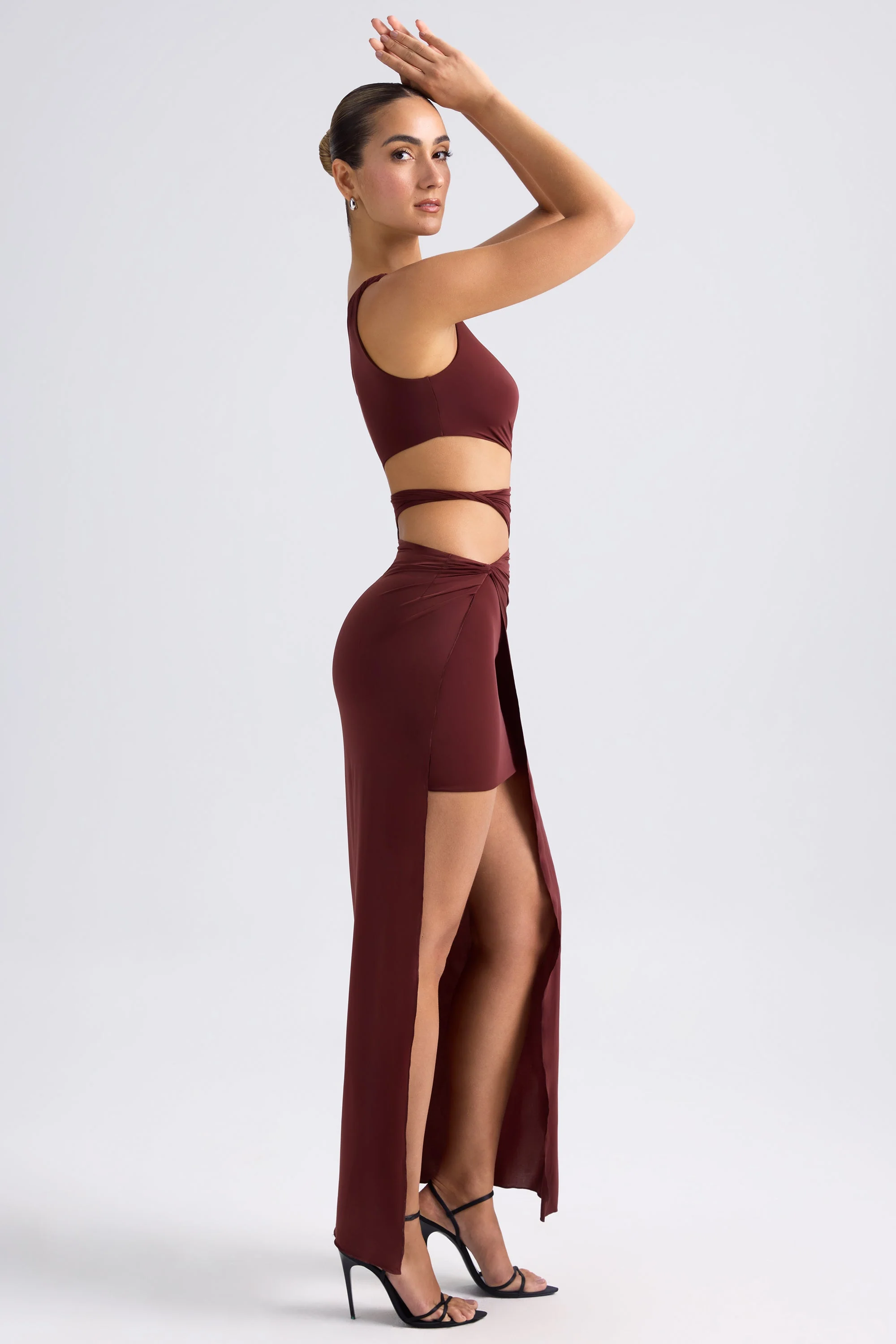 One-Shoulder Draped Cut-Out Maxi Dress in Chestnut Brown