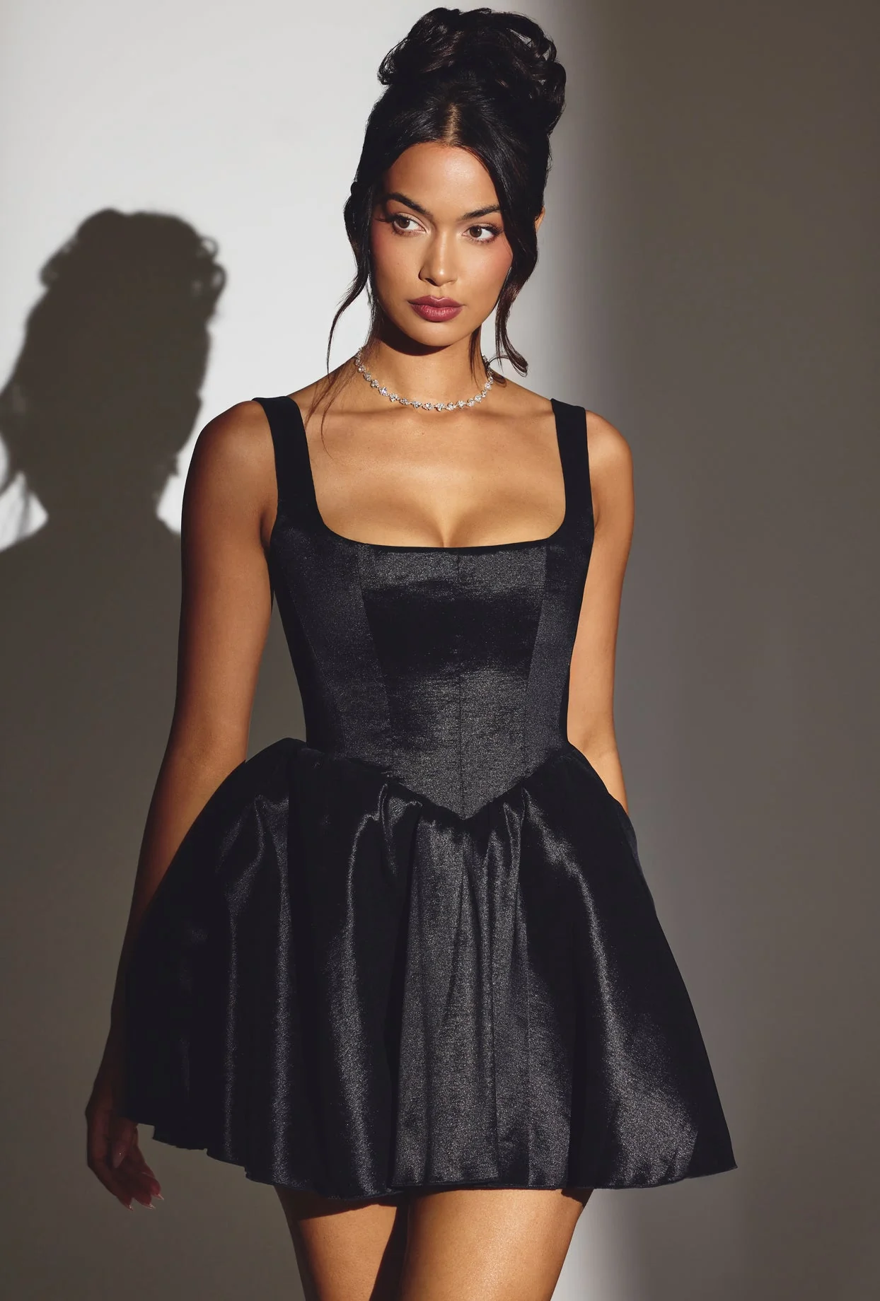 Velvet Long Sleeve Corset Mini Dress in Jet Black