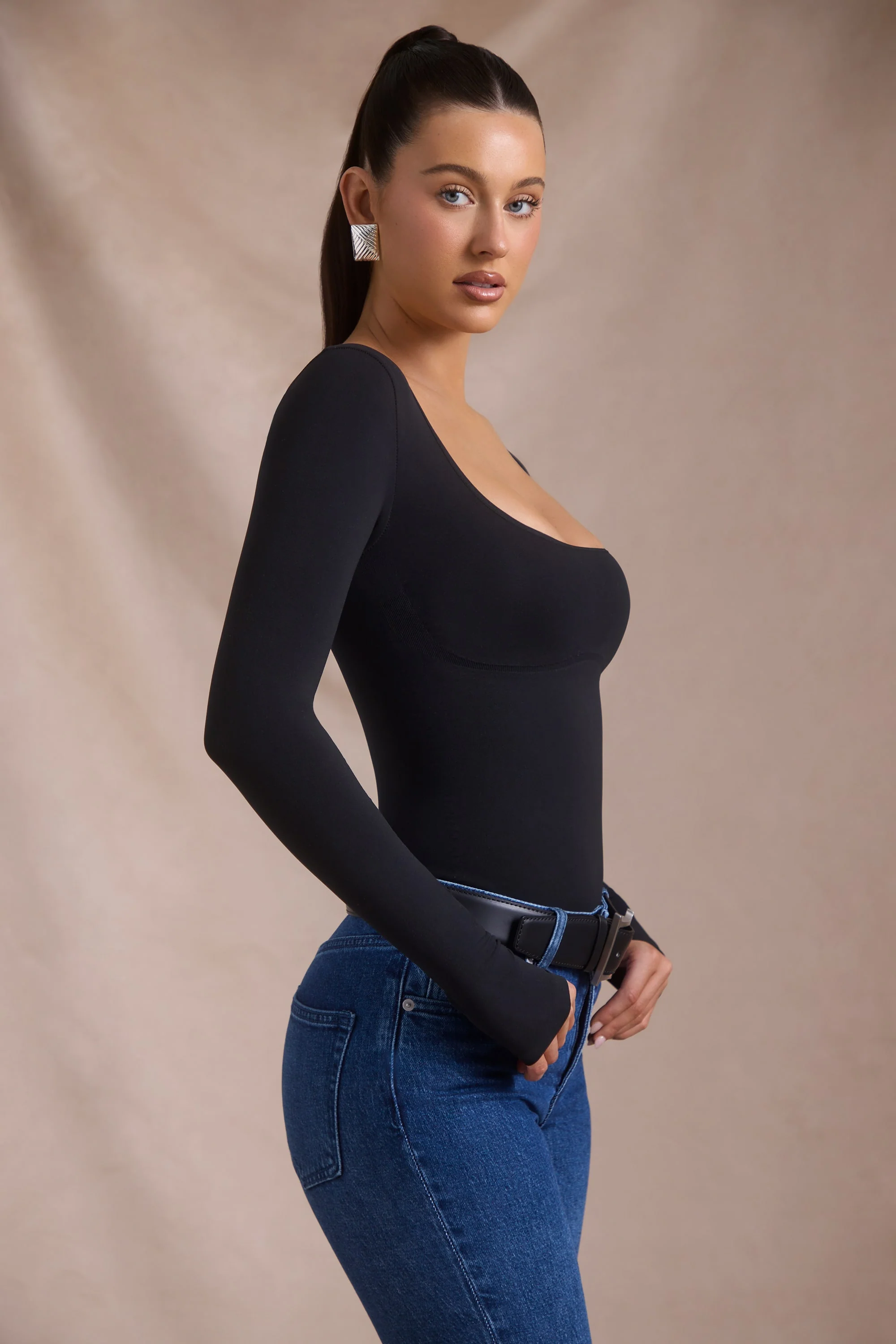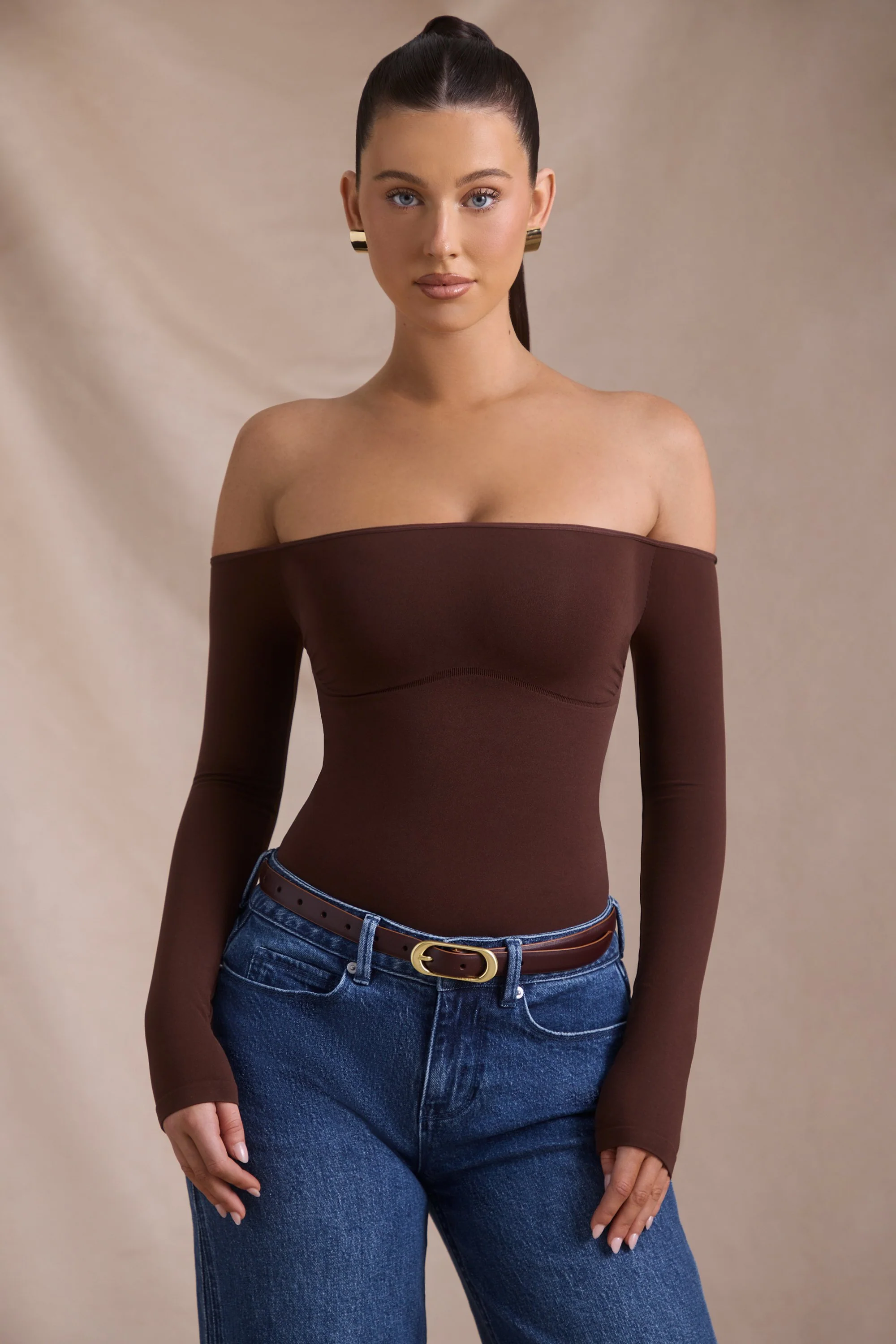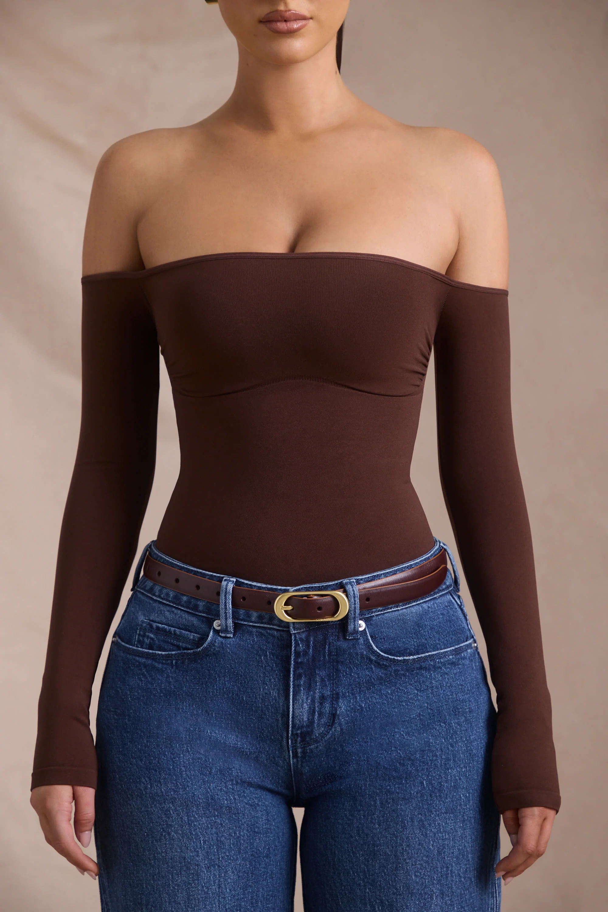 Seamless Off-Shoulder Long-Sleeve Bodysuit in Espresso