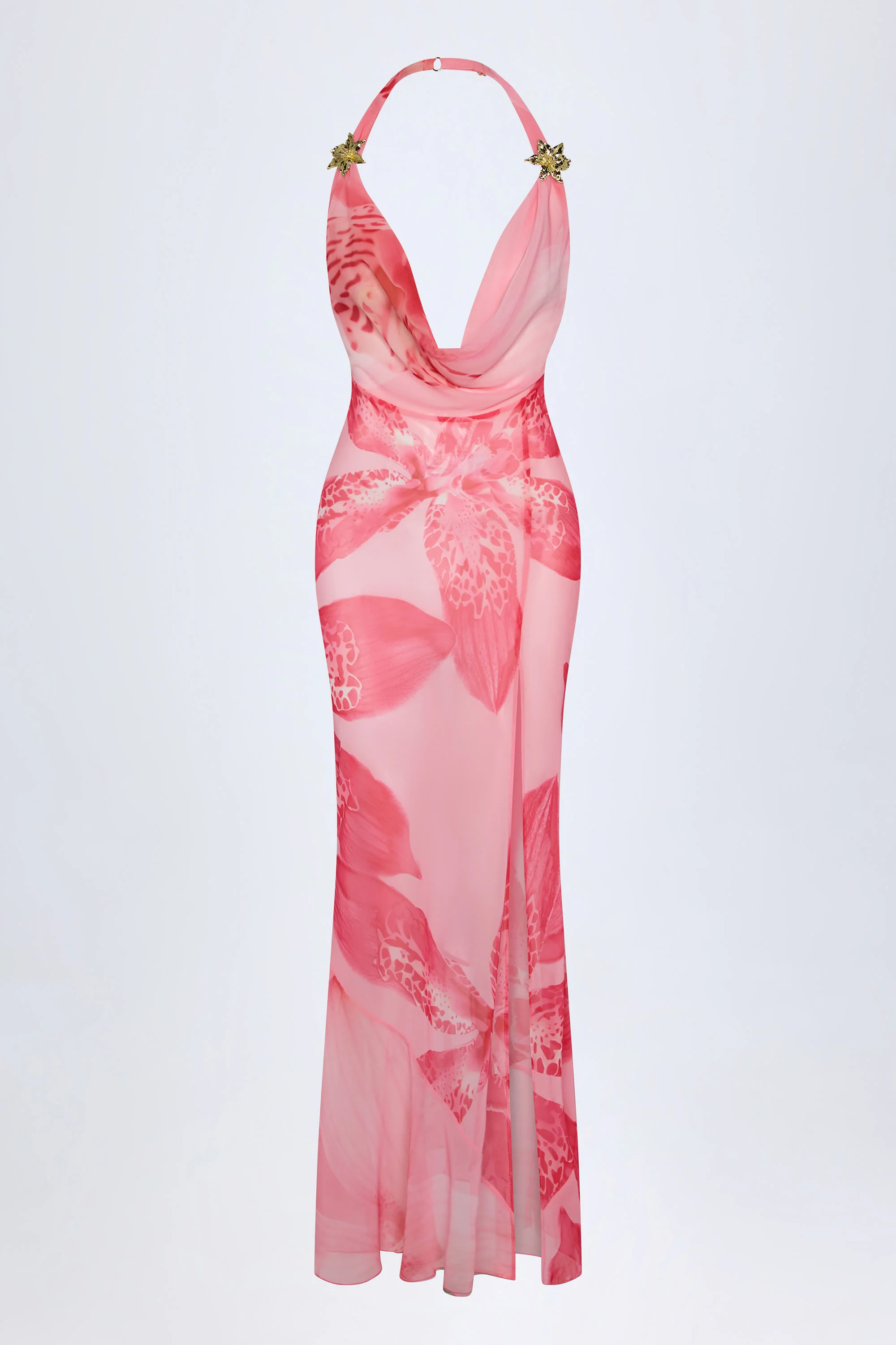 Cowl-Neck Hardware-Detail Maxi Dress in Pink Orchid Print